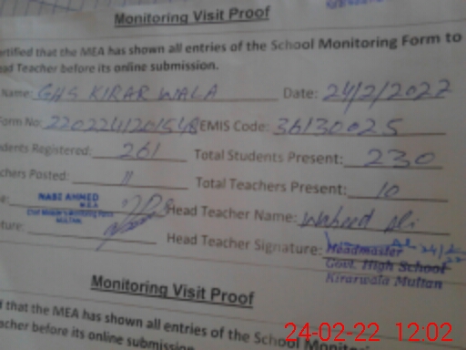 | EMIS Code: 36130025 | Name of School: GHS KIRAR WALA MULTAN | |||