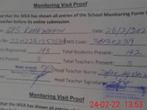 | EMIS Code: 36130239 | Name of School: GPS RANA WAHIN | |||