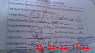 | Total no. of Classrooms: 2 No. of Classrooms Used for Teaching: 1 No. of Classrooms Storing Old Furniture, FTBs, etc: 0Comments if Any: 0 |