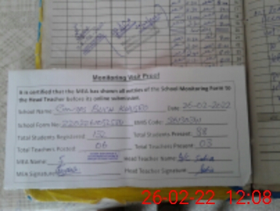 | Total no. of Classrooms: 7 No. of Classrooms Used for Teaching: 2 No. of Classrooms Storing Old Furniture, FTBs, etc: 0Comments if Any: NO SANCTIONED MATERNITY LEAVE APPLICATION OF PST ABIDA RAFIQUE IS AVAILABLE TODAY SO SHE IS ABSENT |