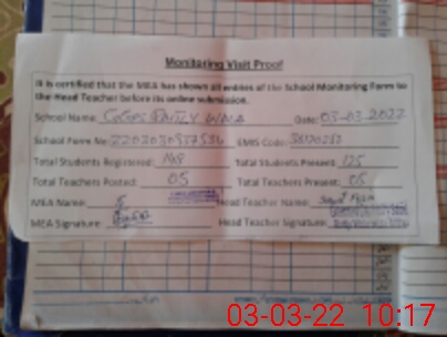 | Attendance Register | Head Teacher | MEA with School | Visit Proof |