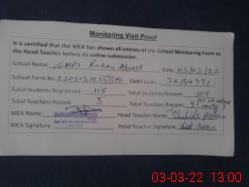 | Attendance Register | Head Teacher | MEA with School | Visit Proof |