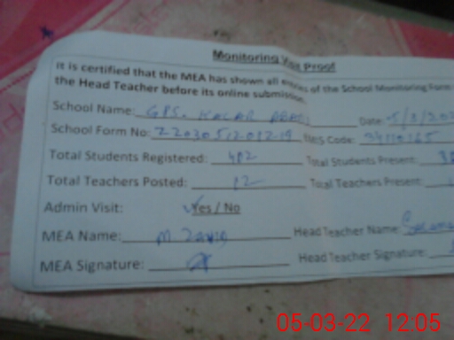 | Attendance Register | Head Teacher | MEA with School | Visit Proof |
