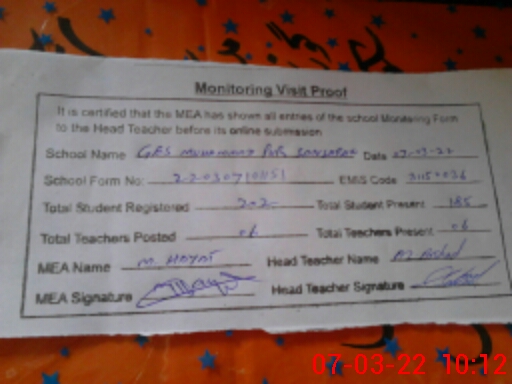 | Certified that this School was Inspected by the Undersigned MEA/DMO Today and the Information Stated Above is as Per Record. | |||||