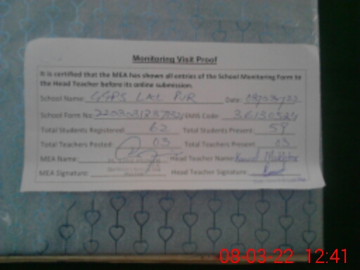 | Certified that this School was Inspected by the Undersigned MEA/DMO Today and the Information Stated Above is as Per Record. | |||||