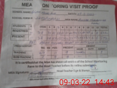 | Attendance Register | Head Teacher | MEA with School | Visit Proof |