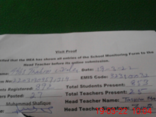 | Name: TA**** MA**** Designation: (School Headmaster's/Headmistress's) HM Phone/Cell Number: 03**** |