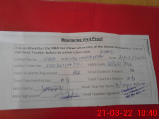 | Attendance Register | Head Teacher | MEA with School | Visit Proof |