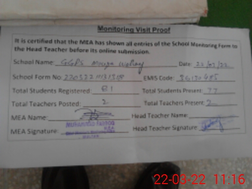| EMIS Code: 36130485 | Name of School: GGPS MOUZA WAHAY | |||