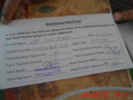 | Attendance Register | Head Teacher | MEA with School | Visit Proof |