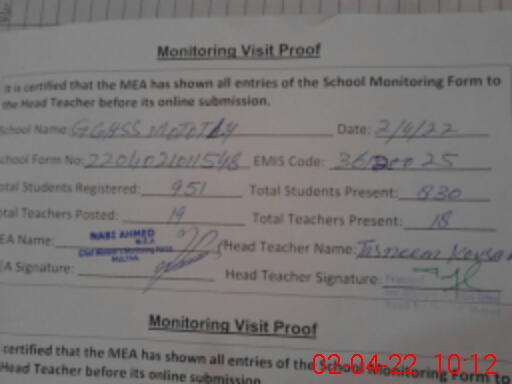 | EMIS Code: 36120025 | Name of School: GGHSS MATOTLY SHUJABAD | |||
