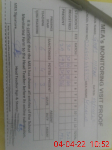 | Attendance Register | Head Teacher | MEA with School | Visit Proof |