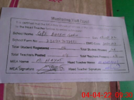 | Attendance Register | Head Teacher | MEA with School | Visit Proof |