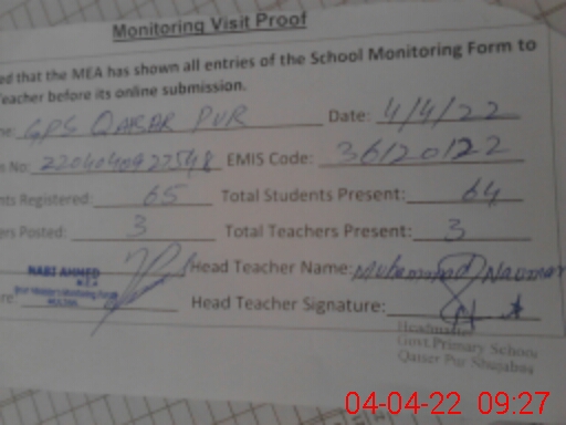 | EMIS Code: 36120122 | Name of School: GPS QAISAR PUR P/O MATOTLI SHUJABAD | |||