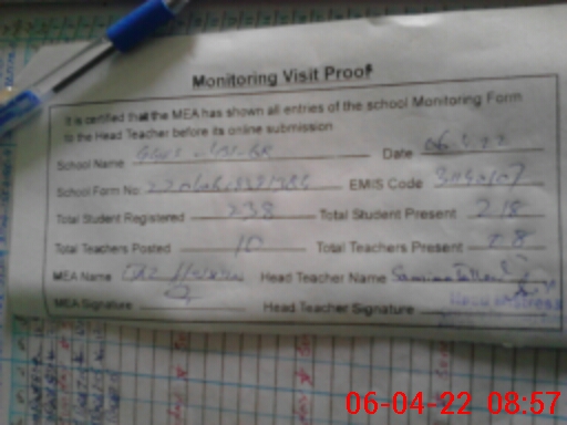 | Attendance Register | Head Teacher | MEA with School | Visit Proof |