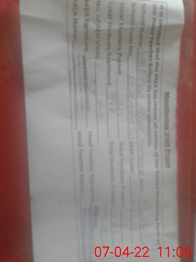 | Certified that this School was Inspected by the Undersigned MEA/DMO Today and the Information Stated Above is as Per Record. | |||||
