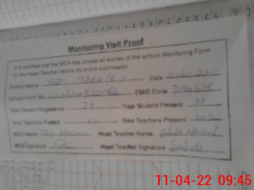 | Attendance Register | Head Teacher | MEA with School | Visit Proof |