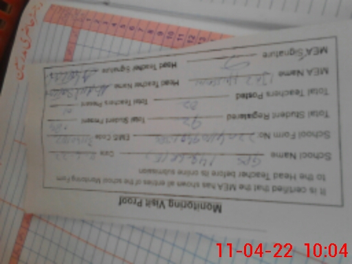 | Attendance Register | Head Teacher | MEA with School | Visit Proof |