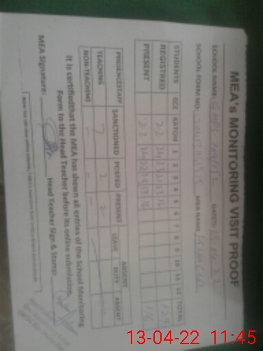 | Attendance Register | Head Teacher | MEA with School | Visit Proof |