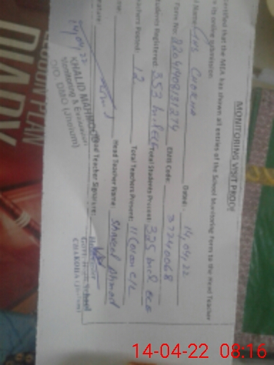 | Total no. of Classrooms: 11 No. of Classrooms Used for Teaching: 9 No. of Classrooms Storing Old Furniture, FTBs, etc: 0Comments if Any: NO VISIT BY HEALTH SUPERVISOR IN SCHOOL SINCE LAST 05 MONTH |