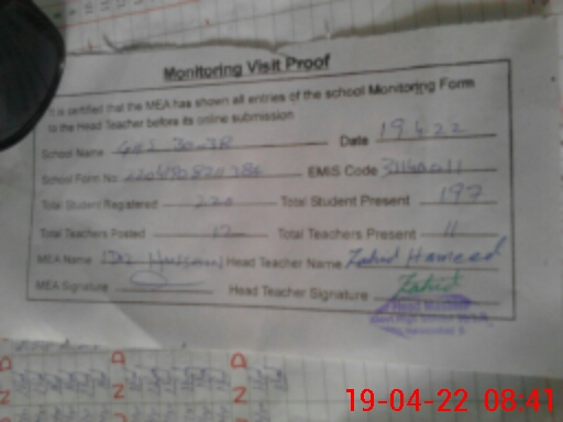 | Attendance Register | Head Teacher | MEA with School | Visit Proof |