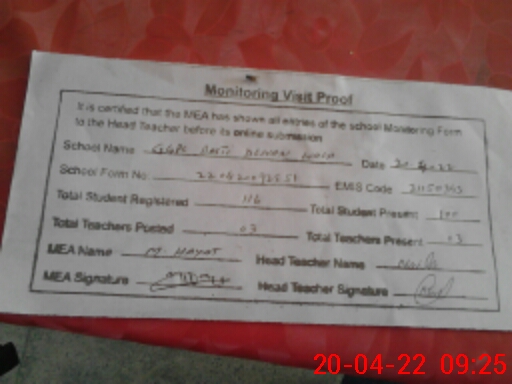 | Attendance Register | Head Teacher | MEA with School | Visit Proof |