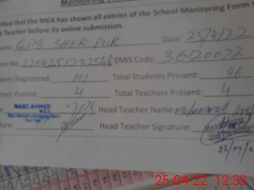 | EMIS Code: 36120072 | Name of School: GPS SHER PUR P/O & TEH SHUJABAD | |||