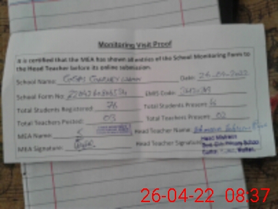 | Attendance Register | Head Teacher | MEA with School | Visit Proof |