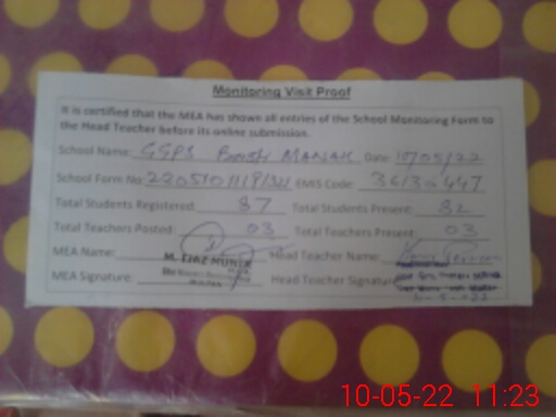 | Certified that this School was Inspected by the Undersigned MEA/DMO Today and the Information Stated Above is as Per Record. | |||||