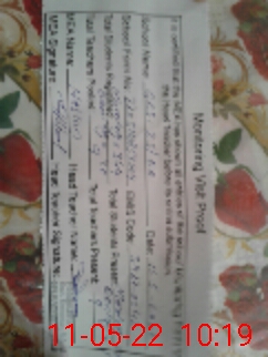 | School Visited by School Health & Nutrition Supervisor (No. of Visits) | 1 | Name1: | Rafia Tabussum | Name2: | Nil |
