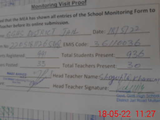 | EMIS Code: 36110036 | Name of School: GGHS DISTRICT JAIL ROAD MULTAN | |||