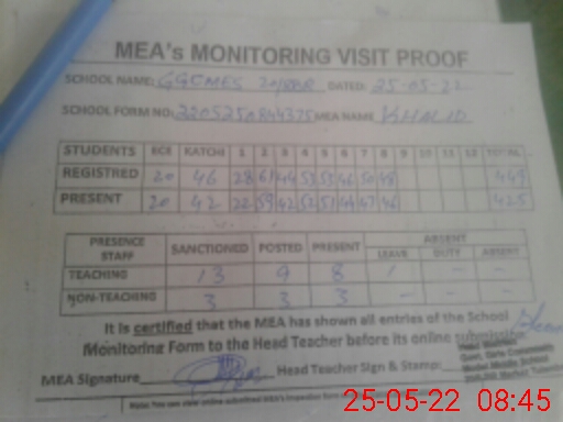 | Attendance Register | Head Teacher | MEA with School | Visit Proof |