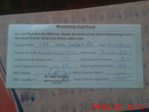 | EMIS Code: 36120357 | Name of School: GPS CHAK SARDAR PUR MOZA SHAH PUR UBHA | |||