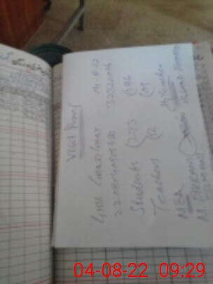 | Remarks (Use Separate Page if Required): In high portion of school bulbs are not present windows panes are also missing in a lot no of windows Even the one door of one room is half broken principal rrshad sb and ss saeed sb came at 0815hrs | |||||