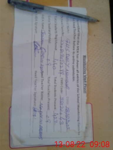 | Total no. of Classrooms: 13 No. of Classrooms Used for Teaching: 13 No. of Classrooms Storing Old Furniture, FTBs, etc: 0Comments if Any: Class 6th 7 th and 8th books were not recived |