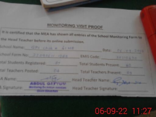 | Attendance Register | Head Teacher | MEA with School | Visit Proof |