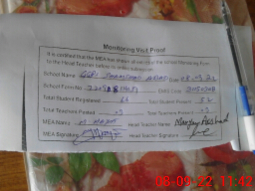 | Attendance Register | Head Teacher | MEA with School | Visit Proof |
