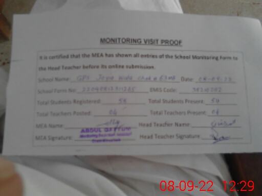 | EMIS Code: 38210282 | Name of School: GPS JOYIA WALA CHAK NO. 63 MB | |||