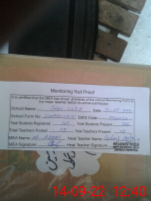 | School Visited by School Health & Nutrition Supervisor (No. of Visits) | 1 | Name1: | Kashif Bashir | Name2: | Nil |