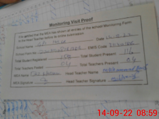 | Attendance Register | Head Teacher | MEA with School | Visit Proof |
