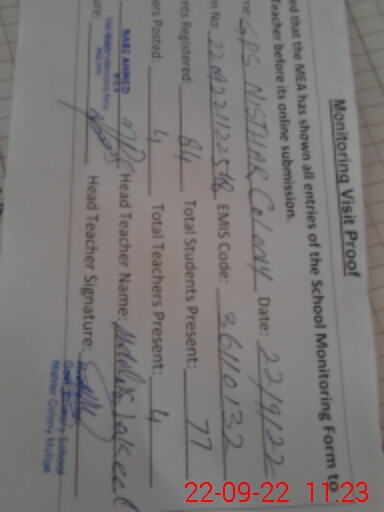 | EMIS Code: 36110132 | Name of School: GPS NISHTAR COLONY MULTAN | |||