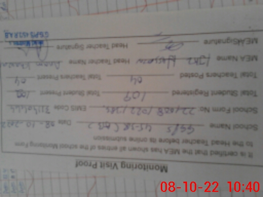 | Certified that this School was Inspected by the Undersigned MEA/DMO Today and the Information Stated Above is as Per Record. | |||||