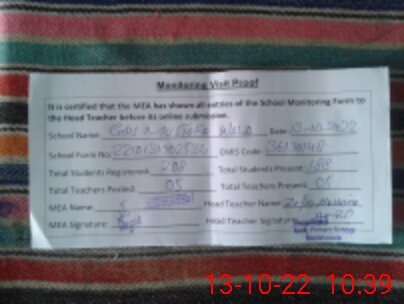 | Attendance Register | Head Teacher | MEA with School | Visit Proof |