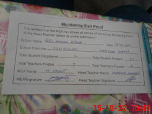 | Certified that this School was Inspected by the Undersigned MEA/DMO Today and the Information Stated Above is as Per Record. | |||||