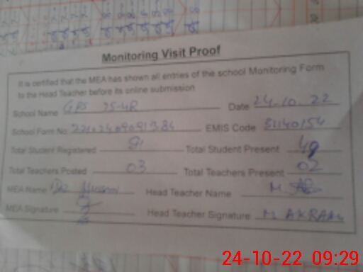 | Certified that this School was Inspected by the Undersigned MEA/DMO Today and the Information Stated Above is as Per Record. | |||||