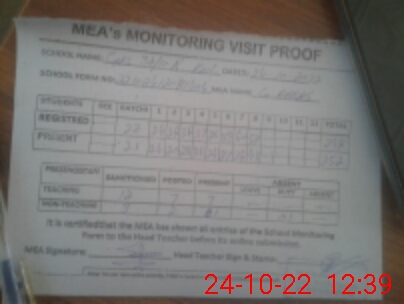 | Attendance Register | Head Teacher | MEA with School | Visit Proof |