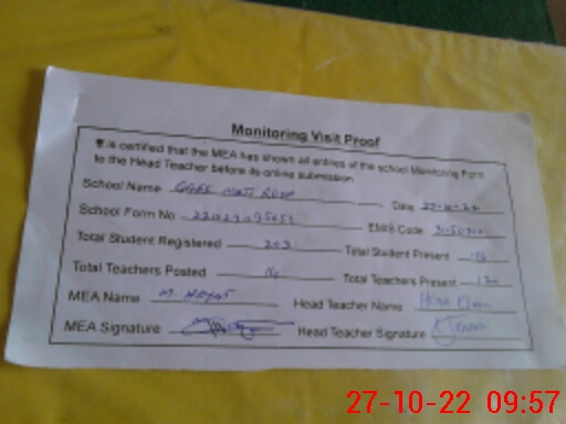 | Attendance Register | Head Teacher | MEA with School | Visit Proof |