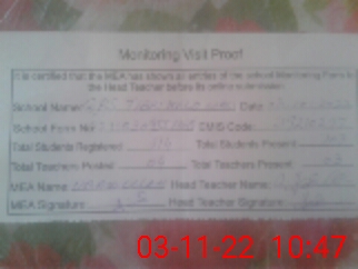 | Attendance Register | Head Teacher | MEA with School | Visit Proof |