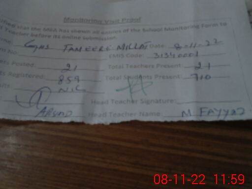 | EMIS Code: 31340001 | Name of School: GHS TAMEER MILLAT | |||