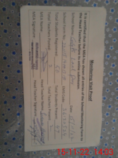 | Attendance Register | Head Teacher | MEA with School | Visit Proof |